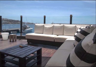 Vistas al mar, piso de tarima y carpas para proporcionar sombra.